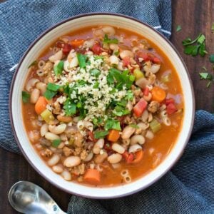 While the two dishes are quite similar, they each have their own identity. Pasta fagioli is comprised of pasta and beans, sometimes with meat. Minestrone soup features pasta and beans as well, but is also filled with lots of chunky veggies!
