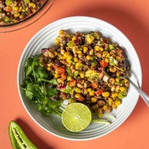 Veggies: I add corn, red onion, and both red and green bell peppers for crunch, sweetness, and a nice pop of color.
