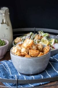 While we all love eating vegan French toast casserole on a Saturday morning made of stale or leftover bread, these little bites are way quicker to make and great for adding the perfect crunch to salads and soups. Plus, my boys never even notice they’re eating their leftovers! Ha.