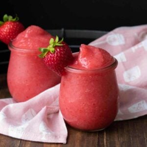 You can serve frosé in wine glasses, jars, or cups garnished with a fresh strawberry. For an extra frosty cocktail, put your glasses in the freezer to get cold before serving!