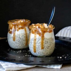 You can customize this chia pudding recipe with any flavors you like. The based peanut butter flavor goes great with so many additions like bananas, berries, my homemade vegan caramel, or even my vegan chocolate sauce!