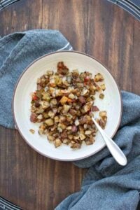 Potatoes: I like to use red potatoes because they roast up tender on the inside and crispy on the outside. They’re hearty and perfect for breakfast.