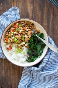 Hoppin’ John is a dish traditionally made with black eyed peas, smoked pork, and onion served with rice and collard greens.
