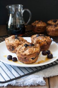 Muffins are great and all but the crumbly texture as my kids shovel them into their mouth can drive me batty. So when I took the idea of traditional blueberry french toast and formed it into a portable muffin, I considered myself a genius.