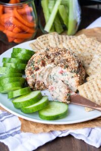 - Once your vegan cheese ball is all done, you can serve it with crackers, fresh veggies, or even just spread it on your tongue and cut out the middle man.