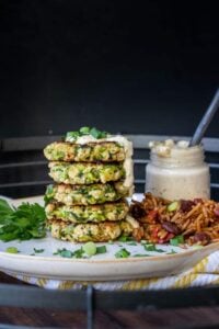 Traditionally zucchini fritters are made with eggs, maybe some dairy, and flour or breadcrumbs. But it’s easy to tweak them to fit whatever diet need you have.
