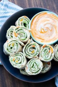 In fact, making pinwheels is even a fabulous kid activity. All you need to do is get out all the fillings and put them into bowls. Then let kids spread on and fill them with what they want. Using a plastic knife is a perfect tool.