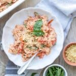 Once the tomatoes are done, add the pasta to the baking dish and toss well. Add the reserved pasta water ¼ cup at a time until you get the consistency you prefer.