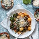 Saute the frozen gnocchi with a little oil, or broth if oil free, in a pan over medium heat until they begin to brown. About 5-7 minutes.