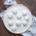 Allow to cool a few minutes but not totally cold. Place them on a platter and sprinkle with the extra powdered sugar. If the cookies aren’t a tiny bit warm, the powdered sugar may not stick on the outside.