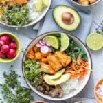 Once the tofu and veggies are done, build the bowls by adding them to the rice and kale.