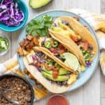 Start your day off right with my delicious vegan breakfast tacos – made with tofu, mushrooms, black beans, and plant-based taco meat! They are super versatile, and are ideal for anyone looking for a balanced, nutritious, family-friendly, high-protein meal. Top with shredded cabbage, creamy avocado, and flavorful salsa for a hearty breakfast that will keep you full for hours!