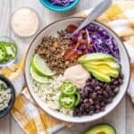 - Taco Meat Tips: If you’re using my lentil walnut taco meat recipe, it makes 4 cups but you only need a quarter cup per bowl. I usually make the full batch and save the rest for future meals.